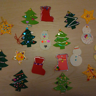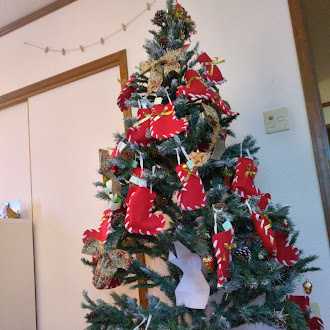 作ったブーツを笑顔でクリスマスツリーに飾っていました。